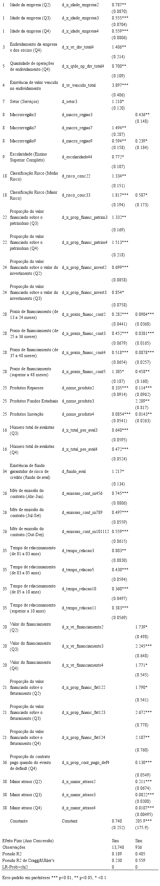 A análise do fator “tempo de atividade da empresa” (d_x_idade_empresa) mostrou que quanto mais antiga a empresa menor a probabilidade de inadimplência. Empresas com atividade entre quatro e nove anos possuem uma probabilidade 22% menor de ter um evento de default do que empresas mais novas, com até quatro anos de idade, ao passo que empresas com mais de nove anos de atividade reduzem a chance de inadimplência em 45%. O resultado corroborou com a perspectiva teórica de que empresas mais antigas tendem a possuir menor exposição à inadimplência, visto estarem associadas a fluxos de caixa mais estáveis, a maior poder de barganha frente aos credores e a menor susceptibilidade a choque externos, além de possuírem maior diversificação de fontes de financiamento, de mercados e de produtos (Bhimani et al., 2010).