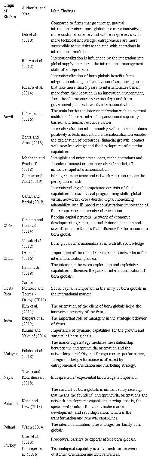 Based on the literature review, Vissak et al. (2012) define born globals as firms that internationalize despite the low level of knowledge on foreign markets. Based on this perspective, and attempting to explain such phenomena, Ribeiro et al. (2012) studied new, small, technology-based Brazilian firms and suggested that these are rapidly internationalizing firms which are likely to be integrated into a global production chain. In addition, Ribeiro et al. (2014) suggest that when firms take more than 5 years to internationalize, they benefit from the location with positive innovation environment, from the partnership in the country of origin and the government support and policies to promote the internationalization of firms.