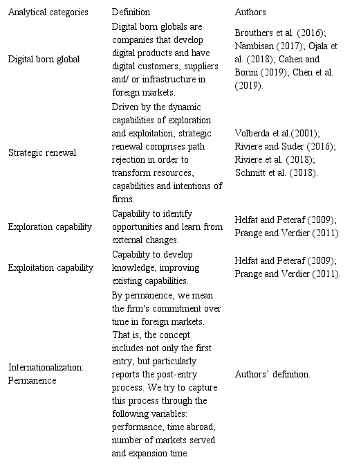 As for the case analysis (as shown in Table 2), we analyzed and codifies the material according to previously established theoretical categories: digital born globals; strategic renovation, with exploration and exploitation subcategories; and permanence, in which references were considered to performance, time abroad, number of markets served and expansion time.
