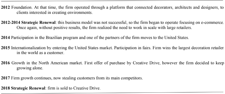 The partners did not accept the proposal, since during 2017 the firm growth was above 1000%. However, in March 2018, the founders and partners opted to sell their startup to Creative Drive for USD $100 million, the second greatest business in Brazil after 99 has been sold to a Chinese group (Exame, 2018). Table 3 briefly describes Decora’s timeline.