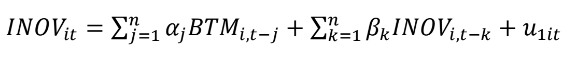 Supposing that the error terms (u) are not correlated and both variables (BTM and R&D) are stationary. The relationship of expected causality is considered unidirectional between the dependent variable (BTM) and R&D expenses (INOV). It is expected that only equation 4 presents statistical significance, demonstrating the direct influence of innovation expenses on expected value generation.