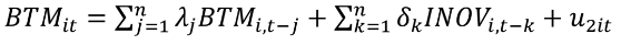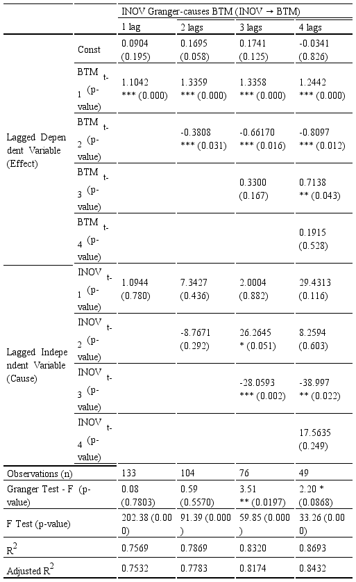 To apply the Granger causality test, time lags from 1 to 4 periods (years) were applied, in both directions of the cause-effect relationship between INOV and BTM. First, we tested the hypothesis that INOV granger-causes BTM (INOV → BTM) and statistical significance was only expected in this case, with a negative effect. After, we tested the secondary hypothesis that BTM granger-causes INOV (BTM → INOV).