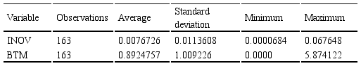 Analyzing the normality of the two variables, it is observed that neither of them present normal behavior from the Shapiro-Wilk test for normality; the test statistics for INOV W = 0.64451 (p-value = 0.0000) and BTM W = 0.68796 (p-value = 0.0000) were obtained, rejecting the normality hypothesis in both variables, which limits the results to this sample.