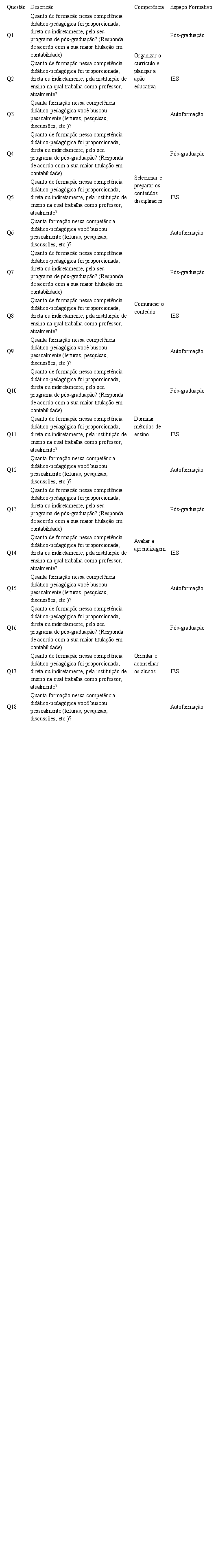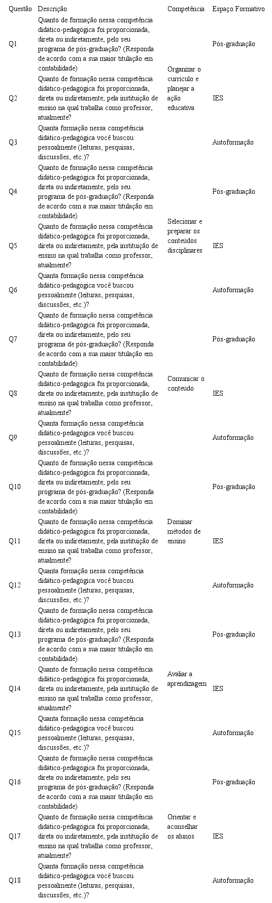 A primeira etapa foi voltada à identificação dos respondentes e abrangeu tópicos como: idade, gênero, se leciona em alguma IES e, em caso positivo, o tipo de instituição de ensino em que trabalha, e o tempo de carreira docente. A segunda parte do questionário foi composta por 18 questões – três questões a respeito dos espaços formativos para cada uma das seis competências propostas por Swain e Stout (2000) como importantes na formação para a docência, são elas: organizar o currículo e planejar a ação educativa; selecionar e preparar os conteúdos disciplinares; comunicar o conteúdo; dominar métodos de ensino; avaliar a aprendizagem; e orientar e aconselhar os alunos.