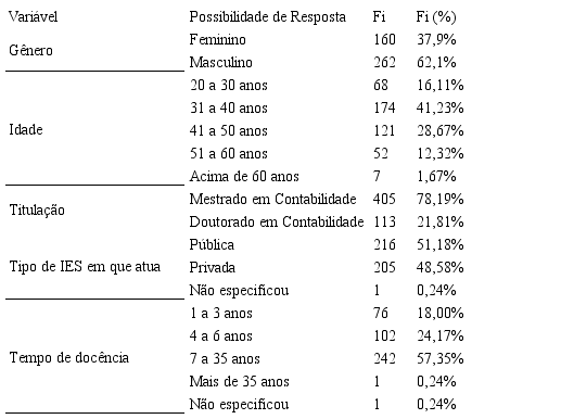 A amostra do estudo foi composta por mestres e doutores titulados nos cursos de pós-graduação em contabilidade, totalizando 512 respondentes. Entretanto, foram excluídos os respondentes que não lecionavam na época da coleta de dados e os que não responderam todas as questões solicitadas no questionário, totalizando, assim, 422 questionários válidos- cerca de 82% dos respondentes.