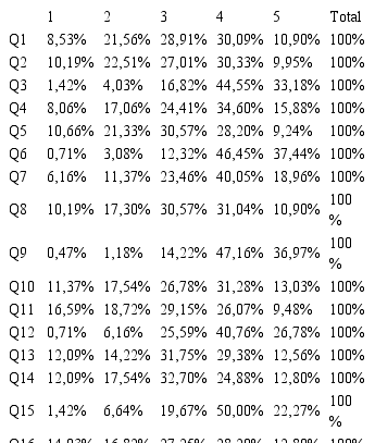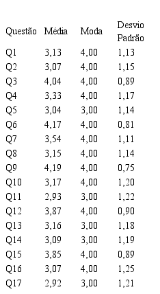 A Tabela 2 apresenta as estatísticas descritivas das respostas às 18 questões.