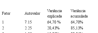 A partir da análise fatorial da amostra, foi possível identificar três fatores, considerando-se o método de autovalor > 1 e o método do scree plot, conforme demonstrado na Tabela 5. Por meio da análise da Tabela 5, é possível verificar o potencial de explicação de cada fator referente à variabilidade dos dados analisados. A coluna de variância explicada demonstra o poder explicativo dos fatores encontrados, em ordem crescente, e como cada fator pode contribuir para adicionar capacidade explicativa à variabilidade dos dados.