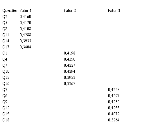 Na Tabela 6, estão demonstrados os fatores e as suas correspondentes cargas fatoriais, com base no método de rotação Varimax padronizado. Essa análise é utilizada para verificar quais são os componentes (questões) que mais influenciaram a composição de cada um dos fatores e, assim, determinar o conteúdo informativo abrangido por cada um deles. É importante ressaltar que, dado que o tamanho da amostra utilizada nesse estudo é maior do que 350 observações (questionários respondidos), as cargas fatoriais acima de 0,3 foram consideradas relevantes para o modelo, a um nível de significância estatística de 5% (Fávero, et al., 2009). Assim, as questões que apresentaram uma carga fatorial maior do que 0,3 compuseram o conteúdo informacional dos fatores encontrados.