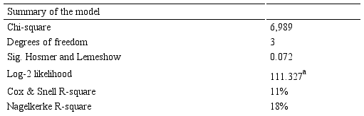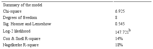 The adjustment ratios of model 1 of logistic regression presented in Table 6, tested by Hosmer-Lemeshow statistical test, presented satisfactory results, with a significance coefficient of 0.545, greater than the minimumof 0.05 recommended (Hair et al., 2009).