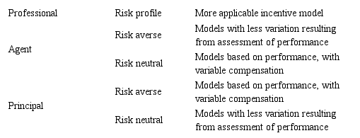 Eisenhardt (1989) mentions some possibilities for a proper balance when sharing risks between the agent and the principal, according to the characteristics of each stakeholder. Risk-neutral agents have a perception with lower risk sensitivity and tend to undertake more uncertainties. On the other hand, risk-averse agents have more risk sensitivity and tend to not accept uncertainties. In the author’s opinion, the incentive model should take into account the agent’s acceptance regarding the principal’s risk transfer, according to Table 1.