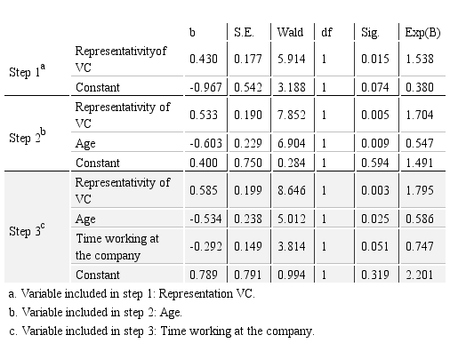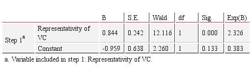 Even though the logistic regression method stepwise forward was used, Table 7 presents that only one step of the model was implemented, as only the independent variable related to VC was considered significant.