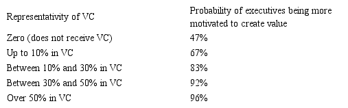 Table 8 demonstrates the the power of persuasion of the incentive program to motivate the executive to create value for the organization. It illustrates the distribution of probabilities of persuading the executive into being motivated to create value as the representativity of VC over the executive’s total compensation increases.