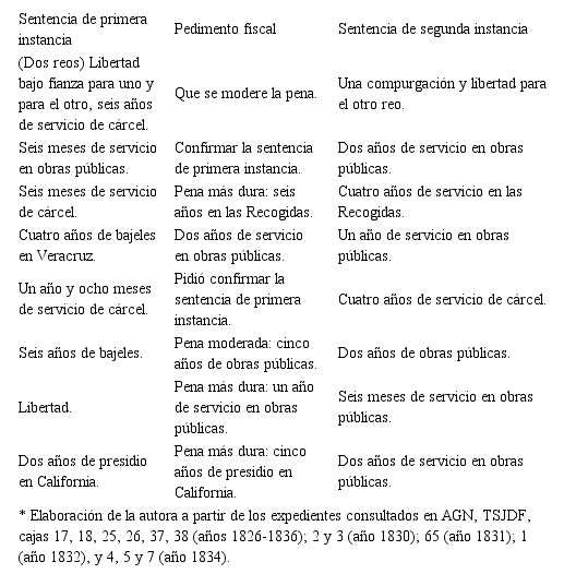 Una sentencia descendente. En el siguiente caso tenemos una situación opuesta a la anterior. En la primera instancia, José María Pérez, homicida de Antonio González, fue sentenciado a la pena de bajeles por cuatro años en Veracruz; ya en la segunda instancia el fiscal pidió que la sentencia de la instancia anterior fuera atenuada a dos años de trabajo en las obras públicas de la ciudad. Al final, el presidente y los ministros de la Corte, determinaron que la sentencia fuera de un año de obras públicas contado desde la fecha de su prisión, lo que significó para José María Pérez purgar tal pena por nueve meses debido a que estuvo tres en prisión.9