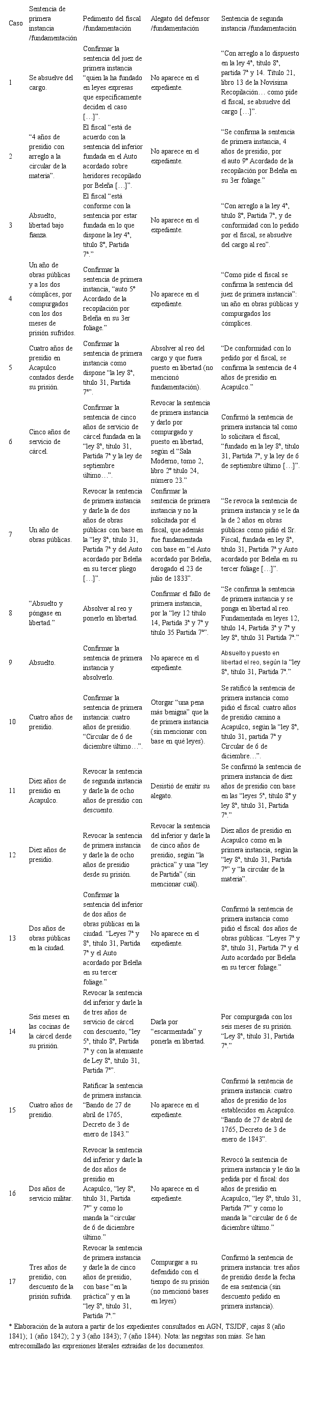 Las leyes más enunciadas durante el arranque de fundamentación de sentencias fueron básicamente la Séptima Partida (mencionada como Partida 7ª), en su ley 8ª, título 31; el Auto acordado sobre heridores recopilado por “Beleña en su tercer foliage”, la Novísima Recopilación y el Sala Moderno, cuerpos legales pertenecientes al derecho de Antiguo Régimen que, como se ve, seguía dominando la escena judicial, de hecho hubo pocas referencias al derecho mexicano: sólo encontré señalada la “ley de 6 de septiembre último”, que al parecer se trataba de una disposición que mandó que todo reo de homicidio fuera remitido al presidio de Acapulco. En términos formales la motivación de la sentencia fue acatada y, en efecto, se reflejó en los expedientes judiciales.