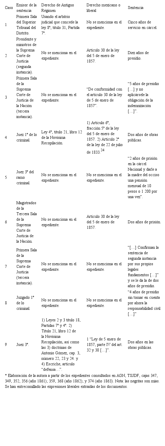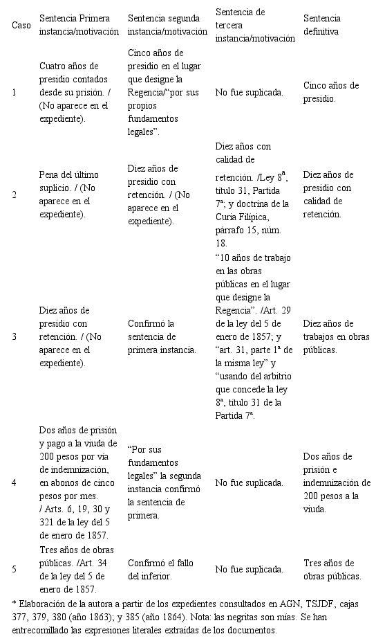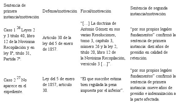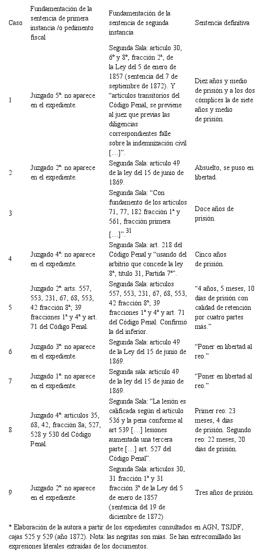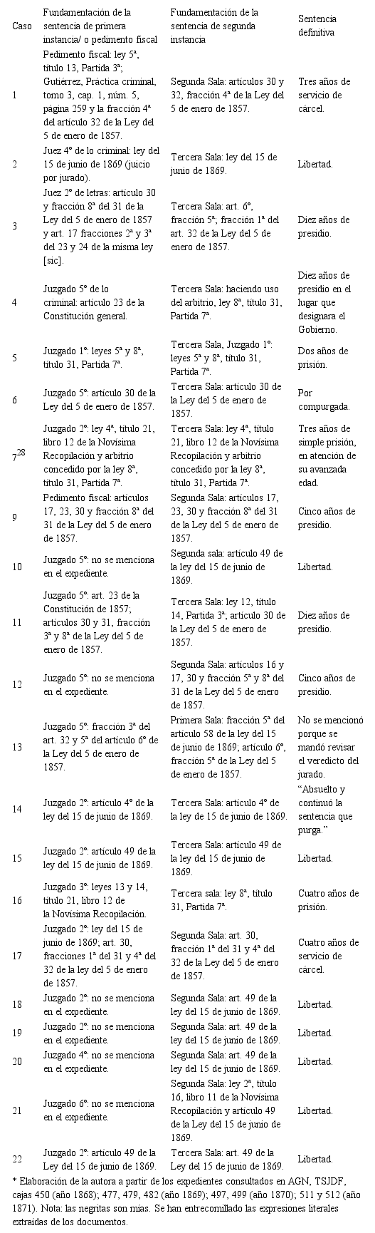 Únicamente en cuatro casos las sentencias definitivas se fundamentaron con leyes viejas. Éstas fueron: en dos sólo con la Ley 8ª, título 31, Partida 7ª (casos 4 y 16); leyes 5ª y 8ª, título 31, Partida 7ª (caso 5); Ley 4ª, título 21, libro 12 de la Novísima Recopilación y arbitrio concedido por la ley 8ª, título 31, Partida 7ª (caso 7). En cuanto a los fundamentos de las sentencias de segunda instancia, éstos son básicamente los mismos que las de primera, observándose cierta concordancia salvo en los casos en que no se refirieron las leyes empleadas. En dos casos (4 y 11) de primera instancia, el artículo 23 de la Constitución de 1857 se enunció como fundamento de la sentencia. Hasta aquí además es posible advertir que, gracias a las leyes mexicanas, hubo no sólo una considerable reducción en la utilización de los viejos cuerpos legales, sino incluso del arbitrio judicial, encarnado, como se ha visto, en la ley 8ª, título 31 de la Séptima Partida.