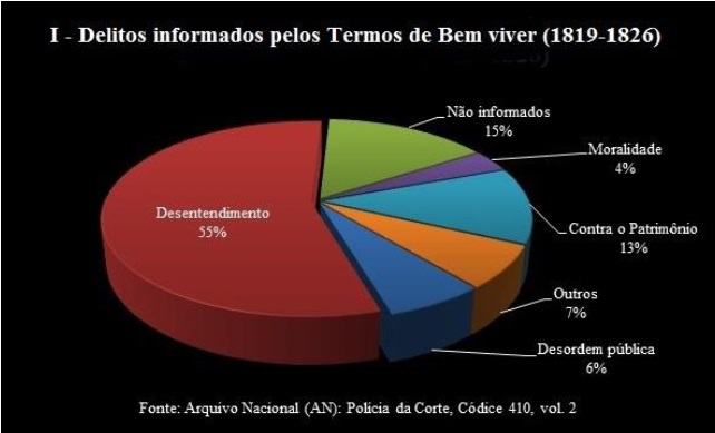 Dos 442 Termos de bem viver analisados na Intendência, entre os anos de 1819 e 1826, 55% se referem a desentendimentos. Sobressaem àqueles envolvendo a vizinhos, motivados por uma testada12 suja, um poço ou até mesmo pelas medidas de um terreno. Isso foi exatamente o que ocorreu entre José da Silva Malafaia e José Lourenço Soares, aos 18 de setembro de 1820. A ordem do Intendente Paulo Fernandes Vianna era clara, ambos deveriam bem viver e “se abster de vias de facto”.13 As pessoas brigavam pelos mais diversos motivos, como pela posse de um escravo, por bens, por uma desilusão amorosa ou traição. As razões são diversas. Alguns desentendimentos levavam a ameaças e até a agressão verbal e física. Isso ocorreu entre Joze Ferreira Baptista e João Pinto Monteiro Dias, que assinaram Termo aos 18 de março de 1825 se comprometendo viver bem e não se inquietarem.14