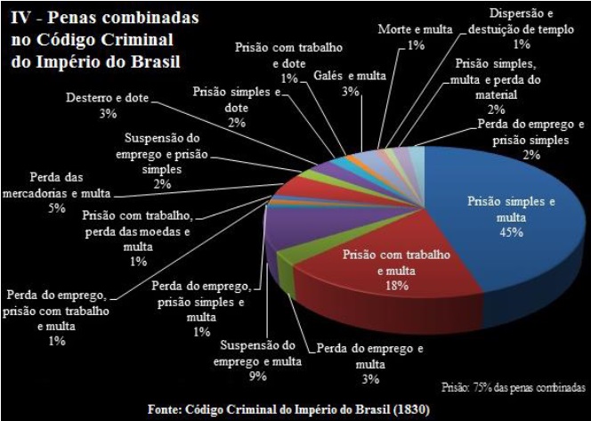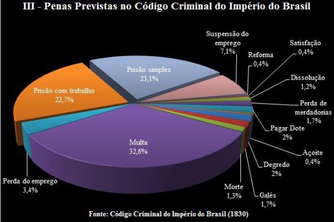 Sublinhe-se, portanto, que no Código Criminal Imperial, praticamente metade de todas as penas previstas, se refere ao encarceramento, o que se torna ainda mais evidente no caso das penas combinadas, principalmente com trabalho, que aproxima as noções de punição, retribuição, educação e domesticação.26