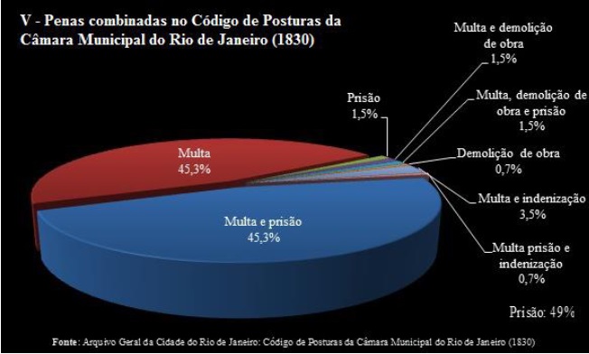 O mesmo ocorre com o Código de Posturas da Câmara Municipal da cidade do Rio de Janeiro, onde a prisão aparece em 49% das penas combinadas – Gráfico 5. Relacionando utilidade e punição destaco a prisão com trabalho. Conforme Gizlene Neder, a prisão com trabalho aparece como punição a quase todos os atentados contra a ordem pública.27 De modo especial, “contra a existência política do Império; contra o exercício dos poderes políticos; contra o livre gozo dos direitos políticos dos cidadãos e contra a segurança interna do Império”.28