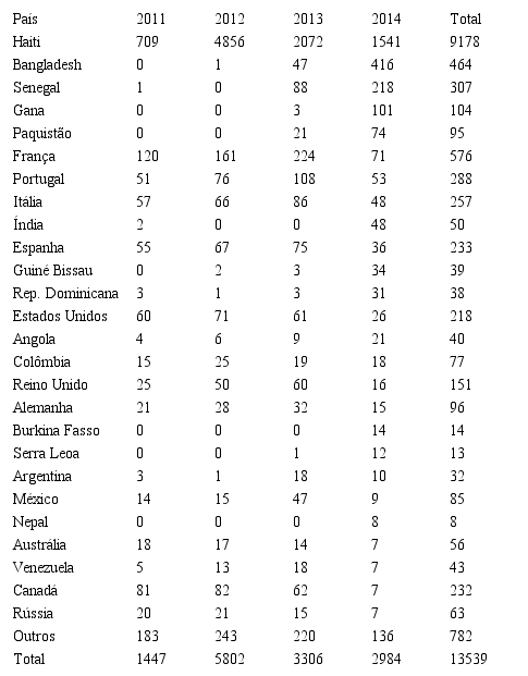 Cabe registrar que, observando a tabela disponibilizada pelo Ministério do Trabalho e Emprego, embora o número de autorizações de trabalho concedidas tenha diminuído no ano de 2013, este número voltou a crescer no primeiro semestre do ano de 2014 e, se confirmada esta proporção, este ano deve ter estabelecido o maior contingente do último quadriênio, confirmando a tendência do Brasil como um país tradicionalmente imigrantista. Se no século XIX e XX predominou a entrada de imigrantes europeus, neste novo milênio vê-se a forte presença de migração do próprio continente e com preponderância de haitianos.