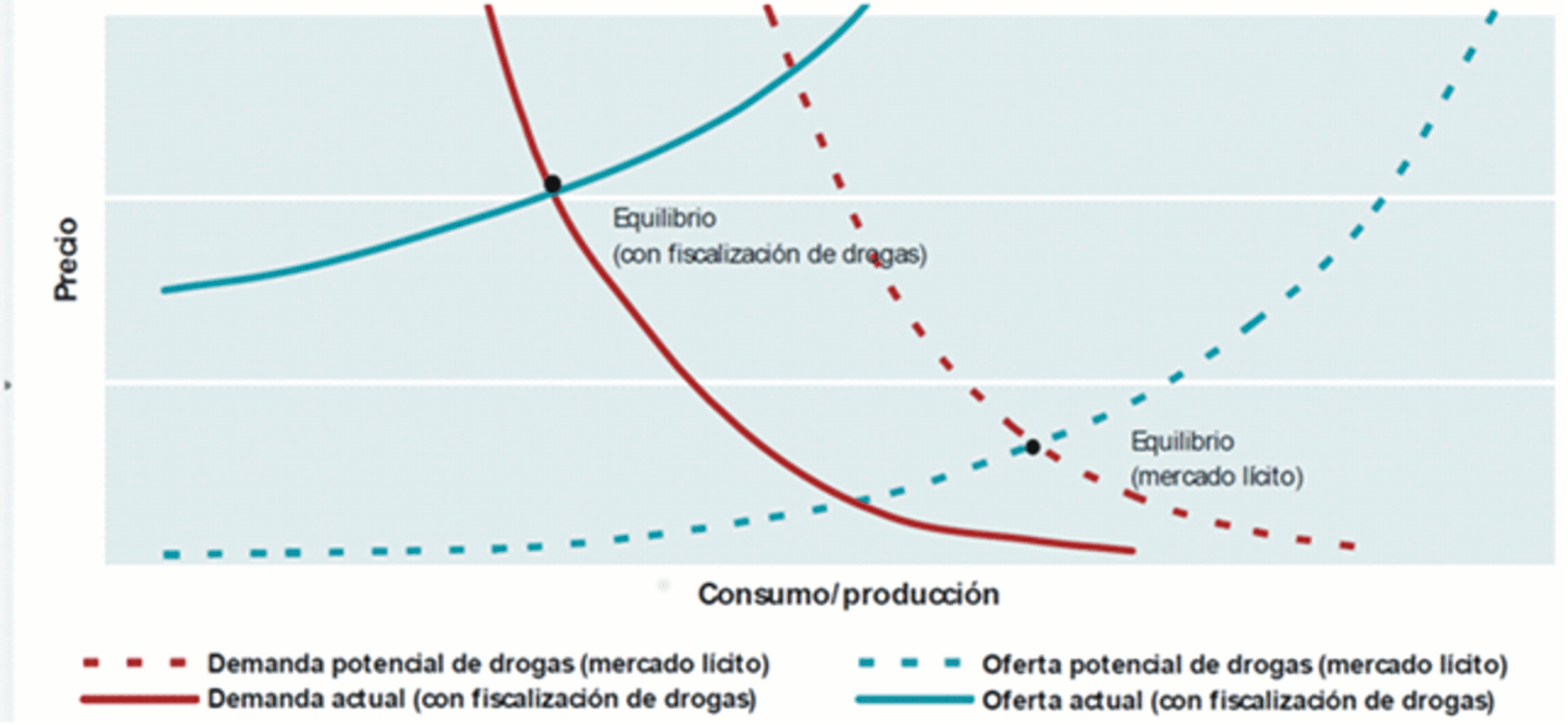 El sistema de fiscalización de drogas incide sobre productores y consumidores. Por el lado de la oferta, la prohibición de la producción y el tráfico redundarán en que una menor cantidad de productores y traficantes estarán dispuestos a correr el riesgo que supone la oferta de drogas, cualquiera sea el precio de mercado. Por lo tanto, tiende a generarse un desplazamiento de la curva de la oferta hacia la izquierda, cuya intensidad depende de la existencia y del rigor de aplicación de la correspondiente legislación.