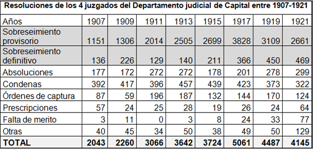 En el ámbito político, las críticas a la justicia relacionadas con la impunidad delictiva se centraban en la justicia de paz en particular, de carácter lega y no rentada, con jurisdicción en delitos menores a un año de arresto. Como ha sostenido Di Gresia, (2014) esta instancia era más bien benevolente, resolvía las causas aplicando penas menores, el abandono del expediente o un acuerdo extrajudicial. No obstante, la justicia del crimen, de carácter rentada y letrada, también manifestaba significativa incapacidad para probar los delitos desde mucho antes de sancionado el código procesal de 1915 (SEDEILLAN, 2012). Una estadística confeccionada por la Corte Suprema sobre el movimiento de causas en el Departamento judicial más grande de la provincia, el de Capital, refleja que los sobreseimientos provisorios y definitivos sumaban en 1907 el 63% de las resoluciones, en 1913 representaban el 73% y en 1921 el 75%, tal como se desprende del siguiente cuadro.