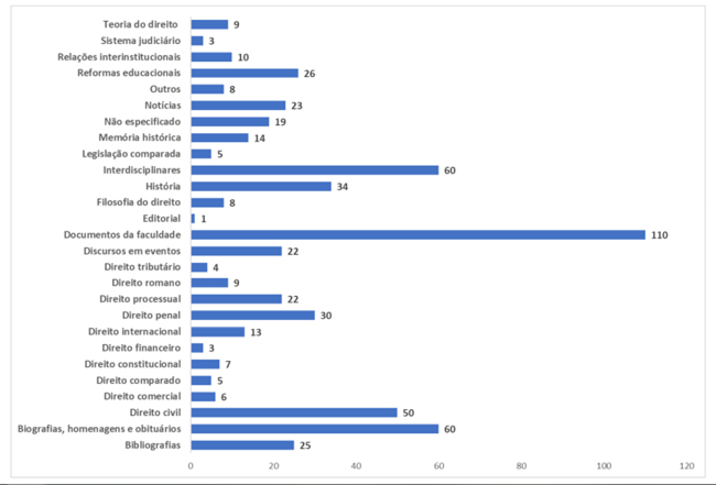 Olhando a composição de artigos algo salta aos olhos de imediato: a enorme quantidade de artigos sobre a própria faculdade (documentos administrativos, listas de bacharéis, relatórios da congregação, etc.). São textos que estão ali na intenção de auxiliar a criação de uma memória para a própria faculdade, documentos selecionados para reconstruir sua história. Revelam o funcionamento da revista como um espaço de divulgação da vida institucional da faculdade e prestação de contas e do esforço por construção de uma narrativa de memória (especialmente se olhados à luz das Memórias históricas) de dentro pra fora, em conformidade com as estratégias de acúmulo de legitimidade institucional (BOURDIEU, 1998). Denotam um movimento de expor ao público a capacidade formadora da instituição e, também, uma preocupação em documentar a atuação dos seus nas disputas intelectuais em que estavam envolvidos.