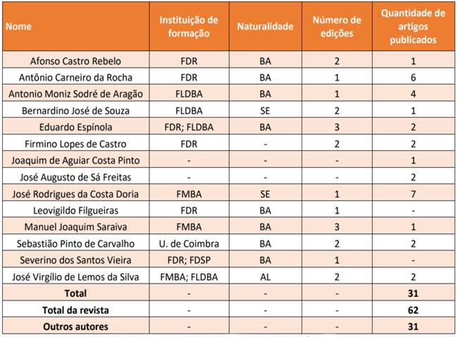 Como na RAFDR, na RFLDBA se destaca a quantidade de artigos de abordagens interdisciplinares com as “novas ciências”. 13 artigos, ou 21%, dos quais mais da metade abordam diretamente a corpo conceitual da antropologia criminal e da medicina legal. São artigos sobre higienismo, “degeneração”, “meretrício”, frenologia, loucura, “devassidão”, psicologia criminal. Isso se explica muito pela forte presença que a intelectualidade ligada à Faculdade de Medicina da Bahia vai ter na FLDBA. Há uma recepção conjugada dos saberes interdisciplinares na medicina com as abordagens epistemológicas vindas de recife. No seu terceiro volume, em 1897, por exemplo, a Revista publica um dos próceres dessa intelectualidade da medicina baiana, Nina Rodrigues. O destaque, contudo, vai para uma figura de menos fama. João Rodrigues da Costa Dória, médico com uma expressiva carreira na política, além de membro das comissões de redação, é o autor mais recorrente da Revista. Foi uma grande liderança do sanitarismo na Bahia, mas transitou por várias das temáticas citadas acima. Na Tabela 1 pode-se confirmar essa conjugação de campos aqui referida, pela presença constante de formados da Faculdade de Medicina nas comissões de redação da RFLDBA.