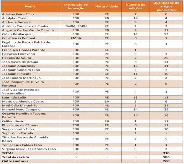 A RAFDR de fato reflete as posições de seu intelectual mais ativo.4 Vai além disso, contudo. Se Clóvis tem o timão, nem sempre o maneja diretamente. Outros autores foram marcantes do processo de editoração da revista. Adolfo Cirne (até 1917), Joaquim Amazonas (até 1924), Joaquim Pimenta (até 1930), Laurindo Leão (até 1922), Manoel Neto Campelo (até 1930) e Octávio Hamilton Tavares Barreto (até 1924) participaram de mais de 10 edições. Participaram, portanto, das diversas épocas de publicação da RAFDR no curso desses 40 anos, entre 1891 e 1931. Junto a Clóvis, compõe uma espécie de núcleo duro que tocou as publicações nesse período.