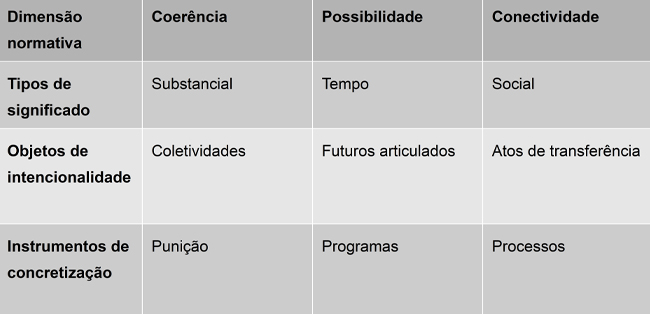 Essas três dimensões normativas também podem ser vistas como as representações das três esferas de significado de qualquer processo social: substancial, temporal e social (LUHMANN, 1974, p. 112). Isso corrobora o fato de que as três dimensões estão sempre presente em um dado tipo de norma, mas em proporções que variam de acordo com os diferentes tipos de processo social a que se destinam e das diferentes circunstâncias que regulam. Na prática, as três dimensões de normas engendram três tipos de intencionalidade expressos pelo objeto aos quais as normas se orientam, isto é, às coletividades, à articulação de futuros e aos atos de transferência, respectivamente, enquanto cada uma das três se fundamenta em três diferentes tipos de instrumento em sua intenção de interligar o fático e o contrafactual: punição, programas de articulação de futuros possíveis ou processos de perpetuação da conectividade.