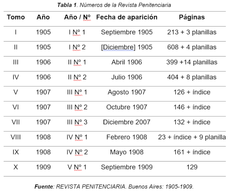 La Tabla 1 presenta un listado de los diez volúmenes publicados, que totalizaron 2.441 páginas numeradas y 368 entradas, entre artículos, notas e informes. De las 368 entradas, poco menos de la mitad (170) corresponden a artículos firmados. Se trata de 74 informes médico-legales y 96 entradas sobre diversas temáticas. De esos artículos, la mayoría (67) fueron escritos por el personal de la Cárcel, mientras que 27 fueron escritos por funcionarios y académicos nacionales y extranjeros, principalmente de origen francés e italiano.