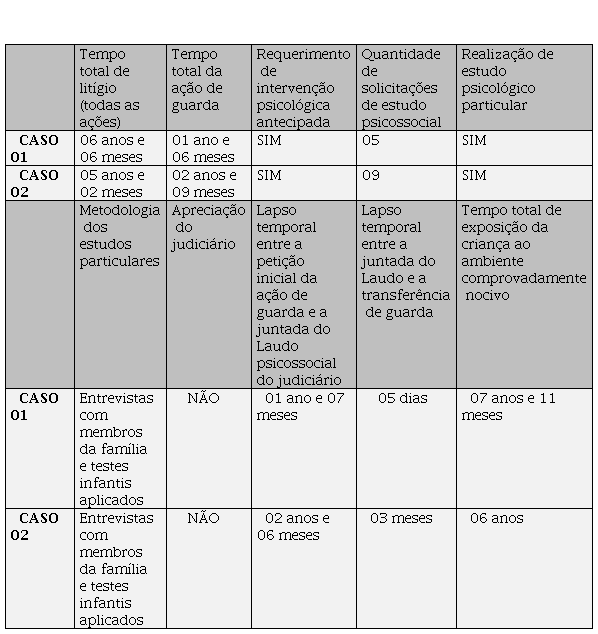 Por ora nos desdobraremos aos objetivos de comparação entre casos em anos distintos, na evolução da legislação vigente e hipóteses acerca do melhor momento de intervenção psicológica nas demandas supracitadas.