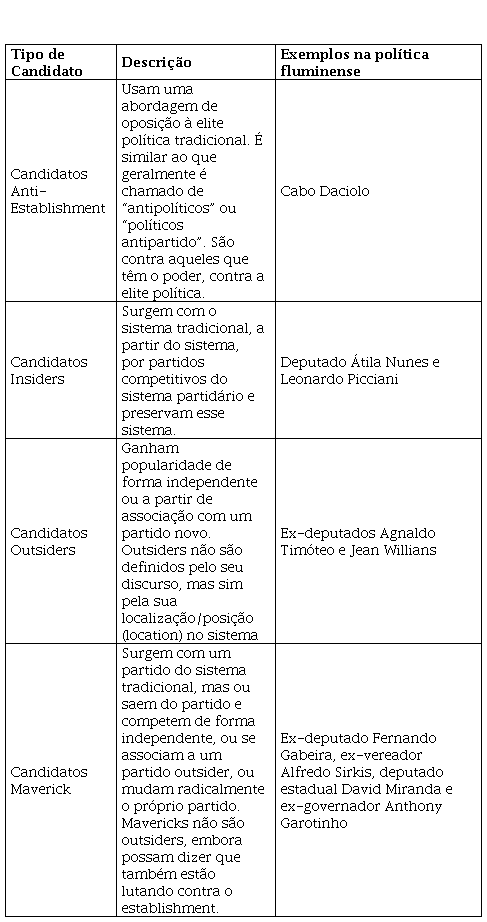 Observando a literatura acerca da tipologia de candidatos (BARR, 2009), sobressaem quatro tipos, organizados na tabela abaixo, na qual aplicamos as categorias à elite política fluminense: