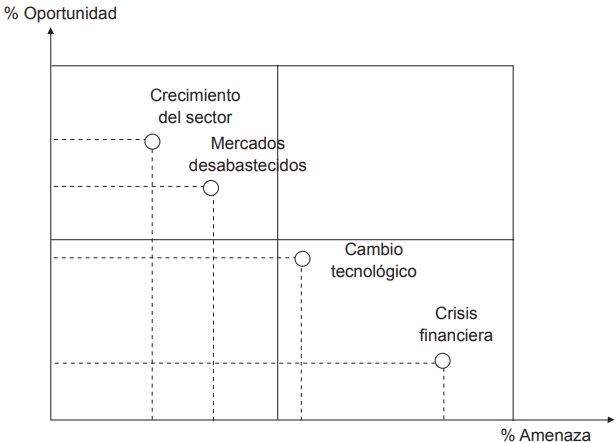 Es importante resaltar que cada oportunidad-amenaza debe estar acompañada por la probabilidad de ocurrencia de cada una, lo cual determinará también su posición en los cuadrantes de la matriz.