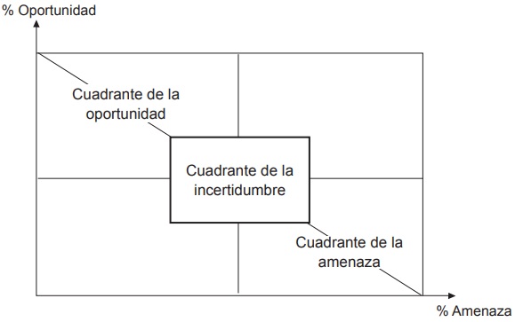 Estas oportunidades y amenazas han sido representadas en un lugar del espectro de la diagonal de la matriz de la figura 3 según sus distintos grados de oportunidad y amenaza, de acuerdo a la probabilidad de convertirse en uno o el otro. En el cuadrante inferior derecho se encontrarán los drivers que tienen una alta probabilidad de ser amenaza y en el cuadrante superior izquierdo los que tienen una alta probabilidad de ser una oportunidad. Si ambas probabilidades se encuentran igualmente distribuidas, acercándose al 50 %, entonces el driver se encontrará en el cuadrante de la incertidumbre, ubicado en el centro de la matriz, según muestra la figura 4.