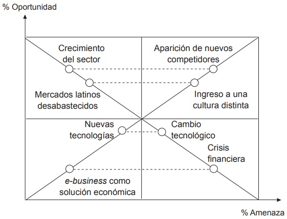 Para esquematizar mejor este ejemplo, se tomará el análisis FODA de una empresa de tecnología de e-business. Al realizar el análisis situacional, se llegó a las siguientes oportunidades y amenazas.
