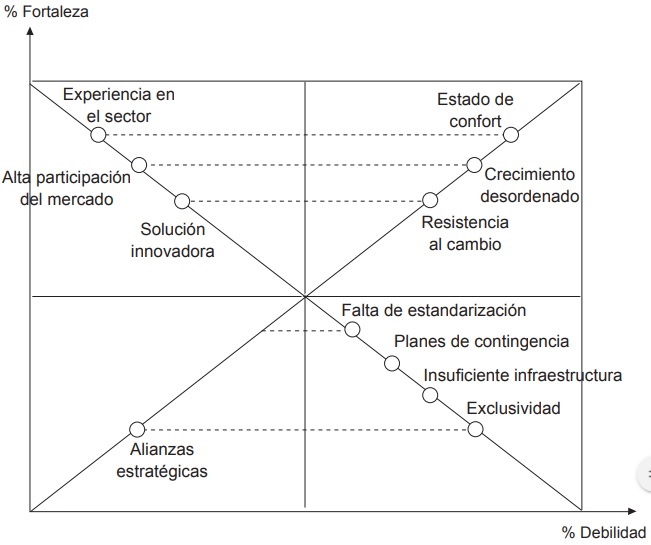 De este listado también se puede encontrar raíces en común entre algunas fortalezas y debilidades. Por ejemplo, al ser esta empresa una pionera en el sector de e-business, el rápido crecimiento del sector (mencionado entre las oportunidades) generó una alta participación de mercado (fortaleza), pero a la vez un crecimiento desordenado que se refleja en la falta de estandarización de procesos, la falta de planes de contingencia operativos y, al mismo tiempo, que se haya llegado rápidamente al tope de crecimiento, causando insuficiente infraestructura para crecer (debilidades). Sin embargo, a pesar de que estos factores tienen una raíz en común, no podemos relacionarlos entre sí a modo de espejo, por lo que será necesario buscar la contraparte de cada uno. Aun así, la contraparte de una debilidad no será necesariamente una fortaleza. Por ejemplo: la falta de estandarización de procesos genera una oportunidad de mejora a través de la realización de manuales de procesos. Sin embargo, si el promedio de empresas en el sector tiene sus procesos mapeados y documentados, esta oportunidad de mejora no se habrá traducido en una fortaleza, sino en alcanzar un estándar del sector, un principio similar al esbozado por Herzberg en psicología. Por ello, las oportunidades de mejora deberán contrastarse con el estándar del sector, a fin de determinar si la debilidad llega a convertirse en fortaleza. En el caso de que no sea así, la debilidad no tendrá una contraparte en la matriz espejo, aunque debe ir acompañada obligatoriamente de una oportunidad de mejora que la elimine como debilidad. Para el ejemplo citado, se asumirá que las debilidades enumeradas son parte del estándar del sector, por lo que su oportunidad de mejora no llevará a una fortaleza. En cambio, las fortalezas sí tendrán una debilidad inherente, según mostraron Ries y Trout. Tanto las fortalezas como las debilidades son ubicadas en la matriz, según el porcentaje de probabilidad que el driver decante en el tiempo hacia una fortaleza o debilidad, al igual que como se hizo con las oportunidades y amenazas (ver figura 6).