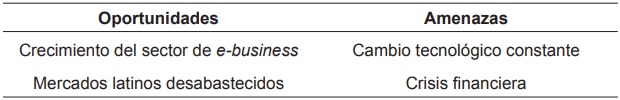En este caso se pueden identificar nuevas oportunidades, que en realidad son un reflejo de su respectiva amenaza y viceversa. La amenaza “cambio tecnológico constante” tiene como contraparte una oportunidad, que es la oportunidad de aprovechar nuevas tecnologías. Ambas representan dos caras de la misma moneda. Asimismo, la oportunidad de “crecimiento en el sector e-business” trae un riesgo expresado en la amenaza “ingreso de potenciales competidores al mercado local”.