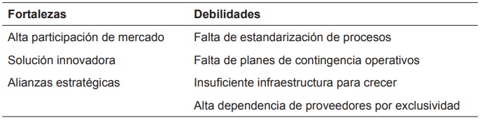 Contar con alianzas estratégicas consolidadas trae consigo exclusividad con un número reducido de empresas, lo que afecta la versatilidad de productos y servicios que se le ofrece al cliente. Finalmente, una solución tecnológica innovadora tiene como debilidad inherente una resistencia en el mercado para adoptarla.