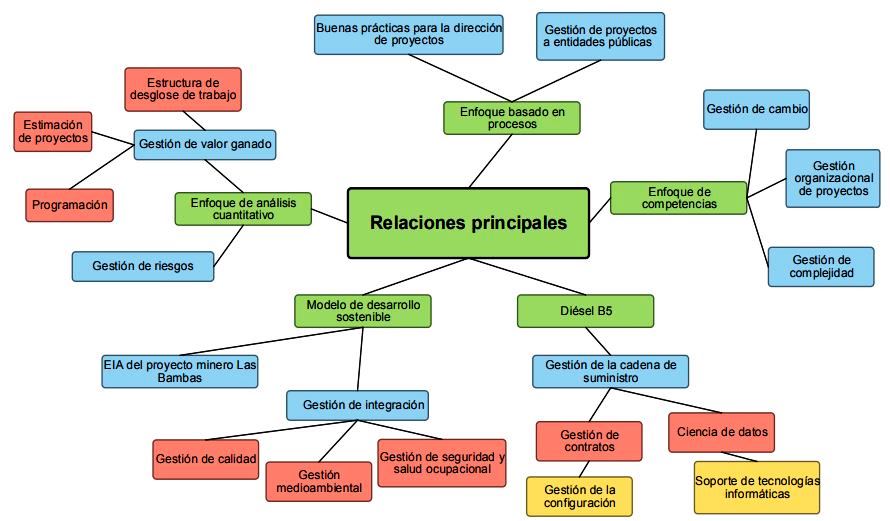 La sostenibilidad es parte de los bloques de relaciones principales y se traduce en considerar los distintos eventos y objetos de la investigación como parte de un modelo de desarrollo sostenible que cuenta, como insumo de información, con el estudio de impacto ambiental del proyecto minero Las Bambas, donde figura la siguiente información: marco legal, descripción del proyecto, metodología para la evaluación de impactos ambientales y sociales entre otros. Según Golder Associates Perú, S. A. (2010), la información anterior tiene la finalidad de cumplir con la legislación peruana. El modelo de desarrollo sostenible se adecúa a la normatividad del Perú también en materia de comercialización de combustible diésel B5 que responde a regulaciones económicas y sociales (Osinergmin, 2015). La normatividad relativa a seguridad industrial minera es de relevancia ya que se permite implementar un sistema de gestión de seguridad (Ministerio de Energía y Minas, 2015), además de aquella que corresponde a la gestión ambiental, pues se propone una regulación acorde con el Reglamento de Protección Gestión Ambiental para las Actividades de Explotación, Beneficio, Labor General, Transporte y Almacenamiento (DS 0402014EM, 2014).