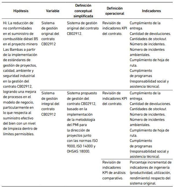 Respecto a la contrastación de la hipótesis principal, se verifica que la implementación de buenas prácticas bajo el enfoque del PMI, junto con aspectos del sistema original relativos a calidad, ambiente y seguridad industrial, contribuye a la generación de un sistema de gestión integral que coloca el nuevo sistema en una mejor condición económica, financiera y social, así como operacional. En este último aspecto, se incrementan las probabilidades de éxito de operar con una unidad suministrada diaria sin defecto; de 68,7 a 87,6 %, dependiendo de la meta de prevención y reducción de incidentes. En cuanto a los aspectos económico, financiero y social, se obtiene un incremento en ventas industriales de 1,6459 % (PEN 17 429 168) y en recaudación de impuestos, de 1,6332 % (PEN 5 207 373).