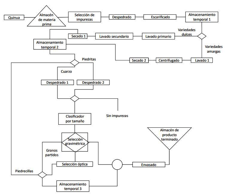 El procesamiento de quinua perlada con el uso de tecnología de sistema continuo (TSC) se detalla en la figura 2, en la cual se observan las operaciones unitarias de selección de impurezas, despedrado, escarificado, lavado primario, lavado secundario, lavado 1, centrifugado, secado 1 y 2, despedrado 1 y 2, clasificado por tamaños, selección gravimétrica, selección óptica y envasado.
