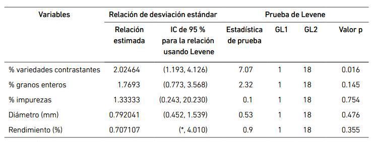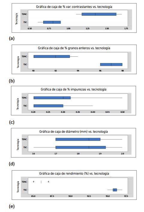 La prueba de intervalo de confianza (IC) para dos variables y la prueba de Levene se muestran en la tabla 5, donde la relación de desviación estándar para IC es de 95 %, y usando Levene se muestra que en el rendimiento no se puede calcular por existir una inconsistencia en los datos obtenidos para dos variables. En las variables variedades contrastantes, granos enteros y rendimiento hay diferencias significativas en el producto obtenido con TSC en comparación con TSNC. Respecto a las variables de impurezas y diámetro del grano no hay diferencias significativas. Estos resultados se detallan en la tabla 5, y en la figura 3 se muestra la gráfica de caja para observar con mayor claridad los resultados obtenidos de la prueba de Levene.