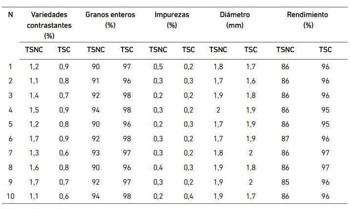 Con TSC, el color de la quinua es uniforme, blanco opaco, con un diámetro de grano de quinua uniforme, sin granos partidos; con TSC y TSNC, el producto final no tiene impurezas; el manejo con TSC es más eficiente que con TSNC.
