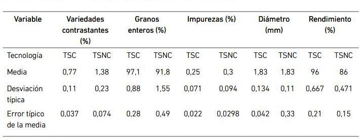 En la tabla 4 se muestran los resultados de la media, la desviación típica y el error típico de la media en el procesamiento de quinua perlada con TSC y TSNC. Se observan diferencias significativas en las variables variedades contrastantes, granos enteros y rendimiento, no existiendo diferencia significativa en las variables impurezas y diámetro.