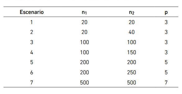 Para investigaciones de este tipo es necesario generar diferentes escenarios que involucren criterios como: el tamaño de muestra, el número de variables consideradas en el estudio y la variabilidad representada en la matriz de covarianza. En esta investigación se utilizaron siete escenarios y solo una cantidad de permutaciones posibles para evitar un gasto computacional innecesario. Un número óptimo de permutaciones para obtener los resultados con una variabilidad máxima de 5 % es 500.