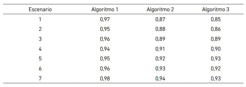 Se puede observar que el algoritmo basado en la prueba T2 de Hotelling presenta una mayor potencia de prueba con respecto a los otros dos algoritmos propuestos. Esto se verificó estadísticamente a un nivel de significación de 0,05, mediante la Prueba de Friedman (p-valor = 0,002), donde se considera a los algoritmos en comparación como tratamientos y a los diferentes escenarios como bloques. Asimismo, al realizar las pruebas de comparación se encuentra que hay diferencia significativa entre los tres algoritmos.