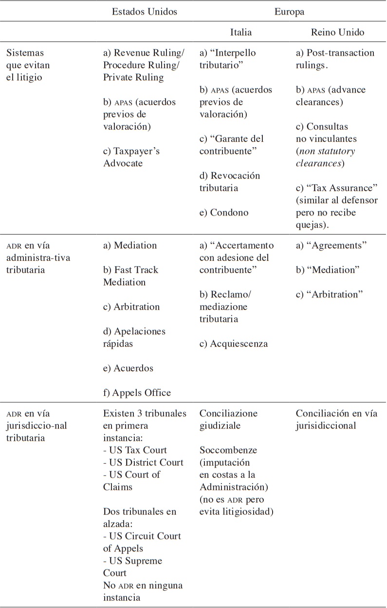 Este hecho es igualmente constatable en otros ordenamientos jurídicos de democracias occidentales, donde cada vez se incrementa más el número de sistemas de ADR en materia tributaria como mecanismo para reducir la litgiosidad, disminuir costes y agilizar la resolución de los litigios.