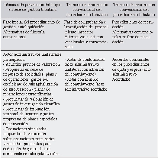 Sí es cierto que en los distintos procedimientos tributarios, y fases del mismo, se han introducido ciertos conatos de sistemas de resolución convencional de litigios y algunas soluciones de carácter paccionado entre la Administración y los contribuyentes, aunque no han gozado de una gran efectividad a la hora de combatir el mal endémico de la litgiosidad tributaria.