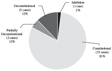 Contrary to the variety of critics who consider prior consultation a problematic issue for mainstream development model and the "general interest"39, in more than 80% of the cases reviewed (33 cases), the Court has found the regulation made by the Parliament to be constitutional (see Graph 2). On just one occasion, "inhibition or dismissal" was the mechanism to reject the study of legal action due to the mediocre quality of the litigation (2%). Decision C-030/08 stands out as clearly the most important and comprehensive precedent related to the abstract control of legislation and the fundamental right to prior consultation.40 In the words of the Court itself in a 2013 decision: