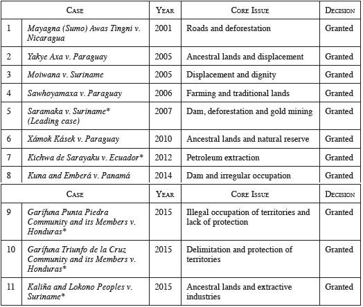 The IACtHR has ruled on prior consultation directly in the cases marked with the asterisk (*) in Table 1. However, the table also contains the judgments in which the court studied issues regarding the protection of territories of indigenous peoples and afro-descendants due to the rich consideration and connection with the territorial interest of the protected groups. Due to the structure of the Inter-American system, contrary to that in Europe, the Commission decides which cases should be studied by the IACtHR. This "filter" and the severity of the violations may explain why in all the cases studied, the Inter-american judges have declared the international responsibility of the states and granted the protection.